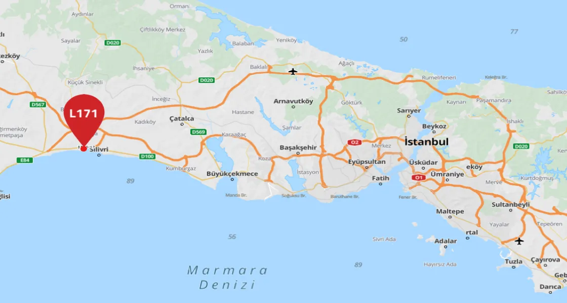 • The land is located in Silivri, close to Beylikduzu and Buyukcekmece, and is located directly on the coast of the Marmara Sea