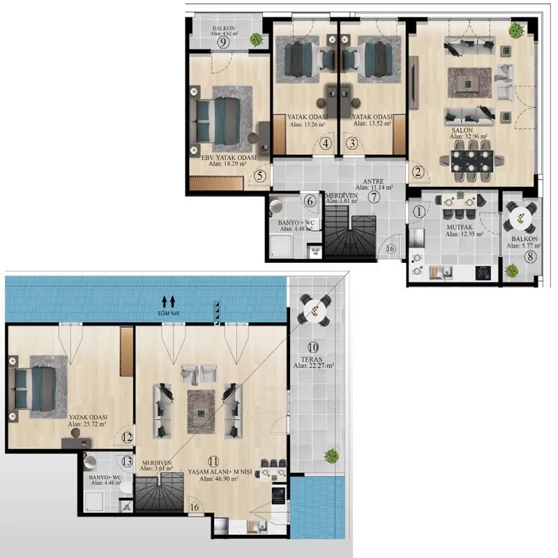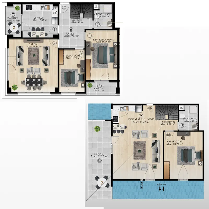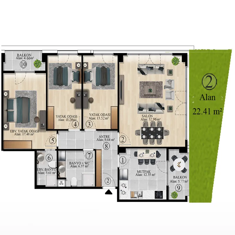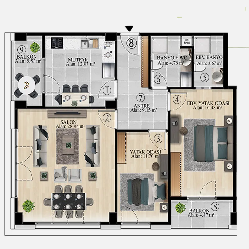 • This new real estate housing project equips your life with social opportunities. Apartments equipped with smart home technology provide an easier life. In addition, bottom heating technology is also available. With Parking Zone, your vehicles are always safe! You can diversify your social life with the gym, sauna, Turkish bath and swimming pool.
