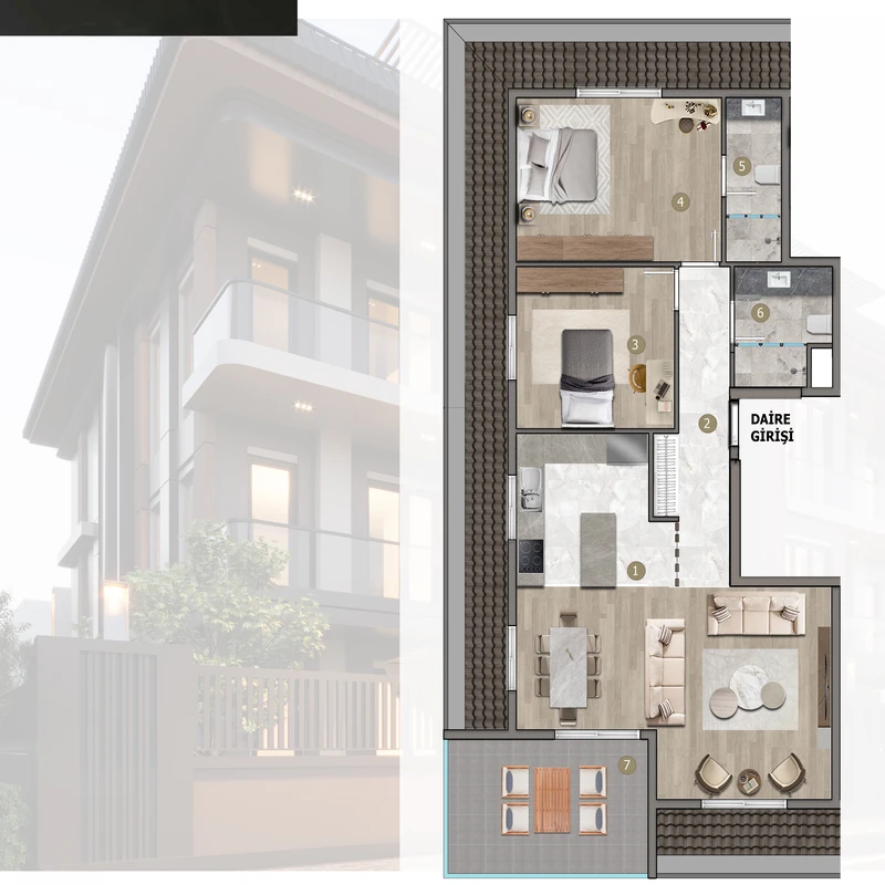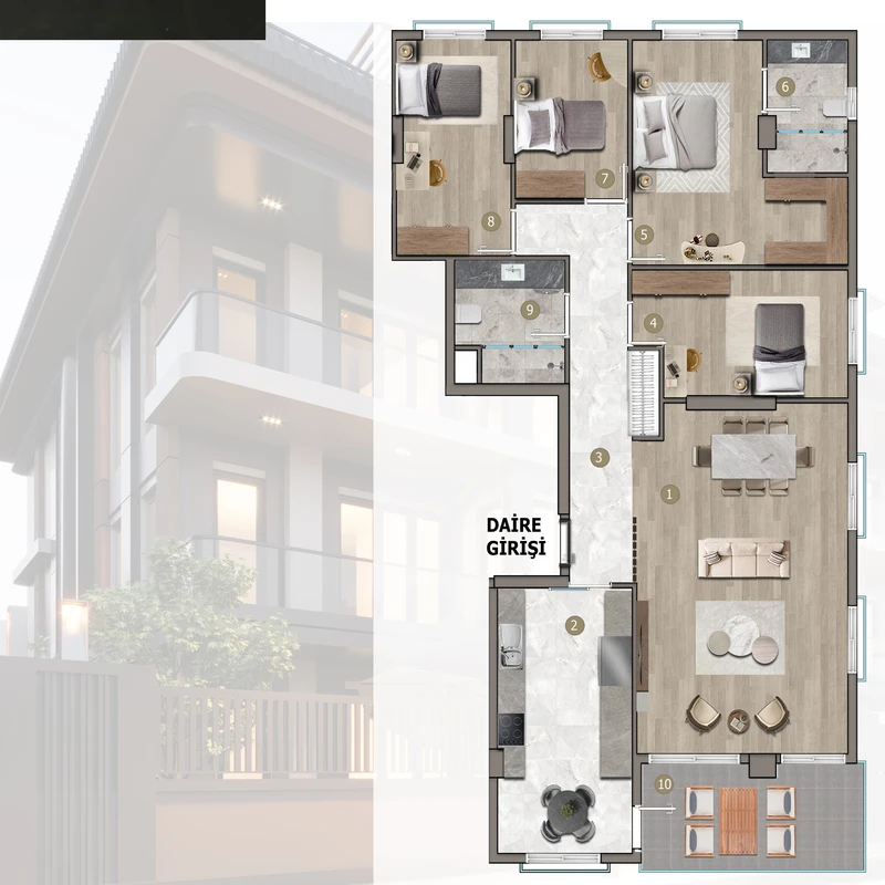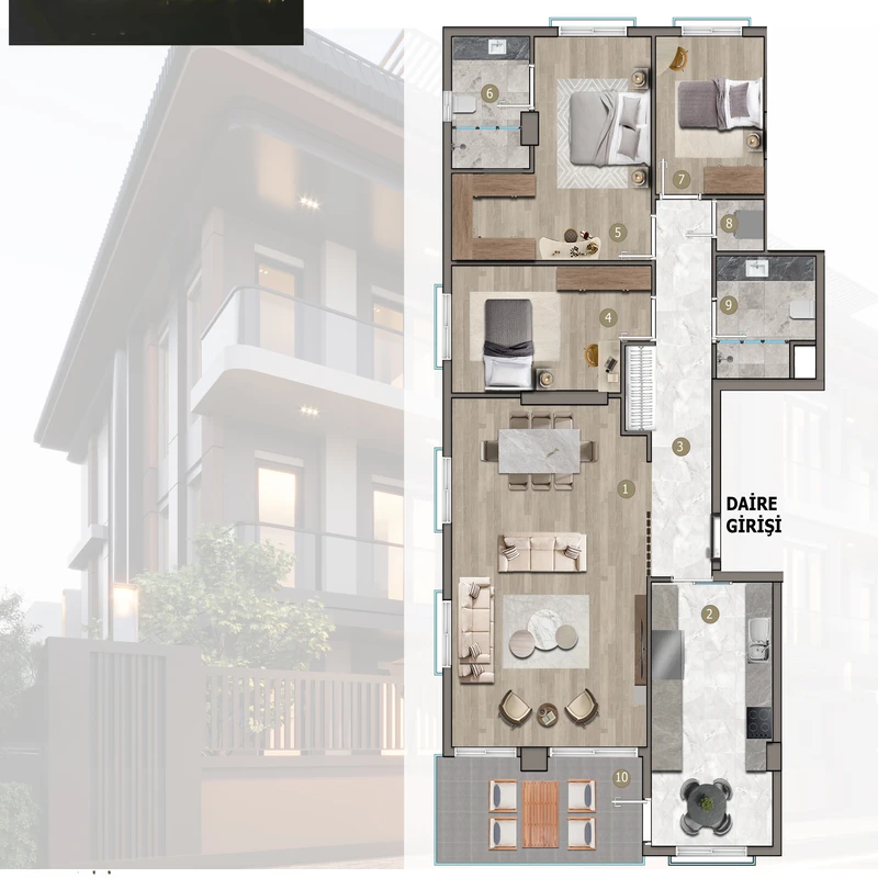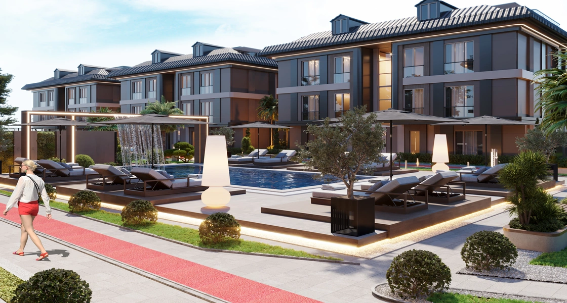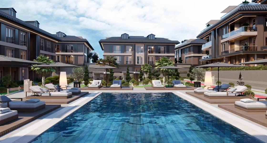 The project is built on a land area of 15,000 square meters and consists of 9 residential blocks or buildings, each with a height of 3 floors. The total number of apartments is 66 residential units. Currently, there are apartment options ranging from 2+1 to 6+1, with sizes starting from 175 to 348 square meters.